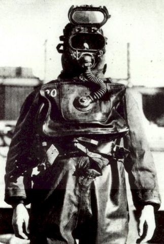Slovenski zanesenjaki, brata, I. in D. Kuščar s prijateljema, D. Leskovškom in M. Zalokarjem, so skoraj hkrati s Francozi in Italijani naredili skafandru podobno kapo, v katero so s površja tlačili zrak z ročno zračno tlačilko in se tako potapljali do 15 m globine.